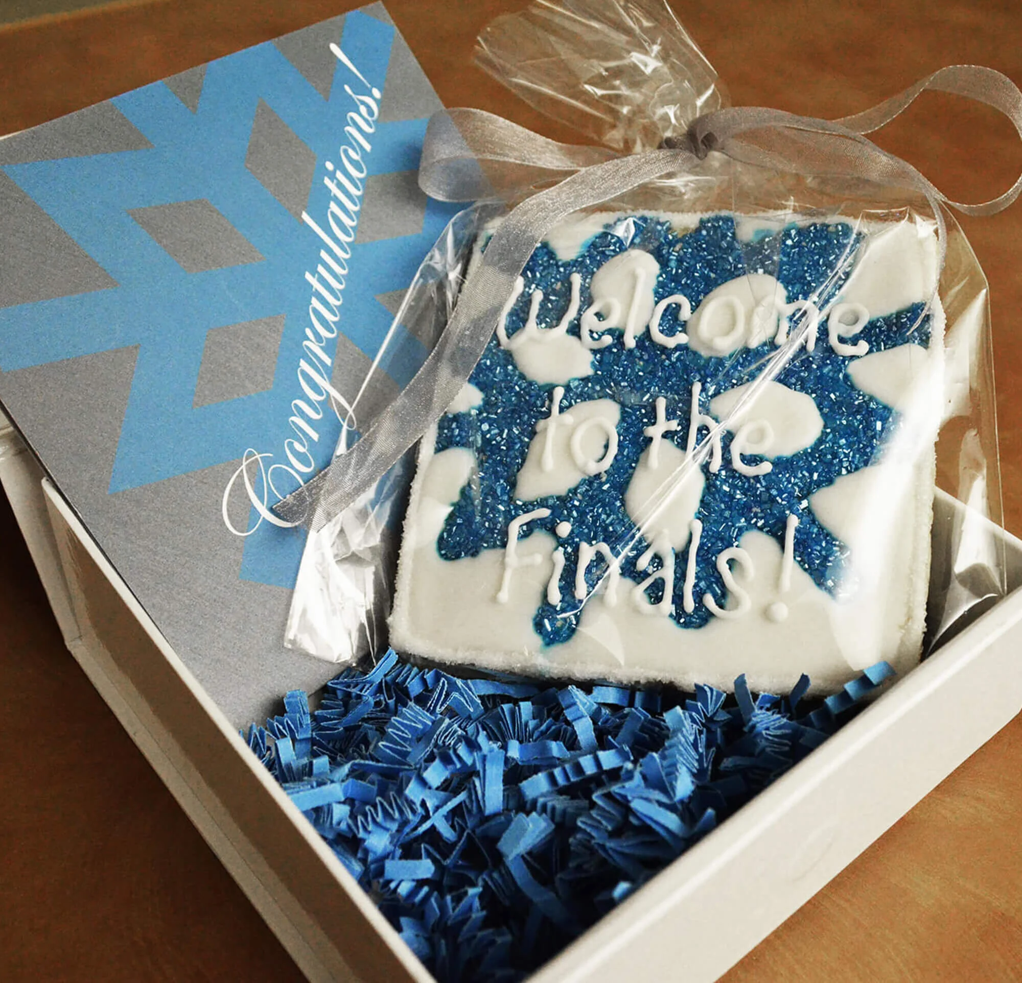 Clarke was hosting on an event where salespeople submitted their pitches for review. Once the finalists were selected, they were invited to a restaurant in Boston to present their pitches in person, and a winner was awarded. My task was to design an invitation for the finalists, and assemble gift boxes containing a “Welcome to the Finals” cookie, the invitation, and a ribbon to tie it all together.