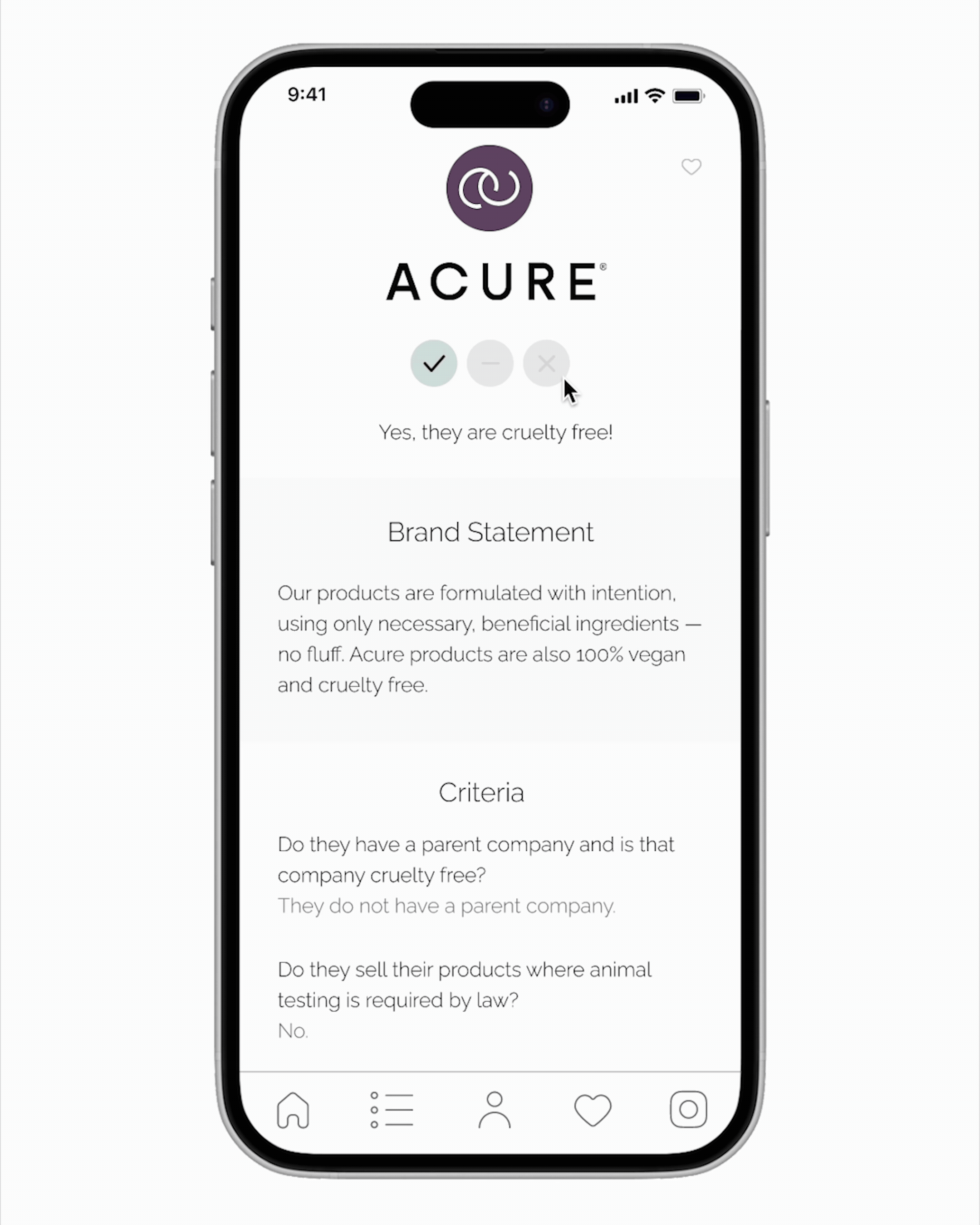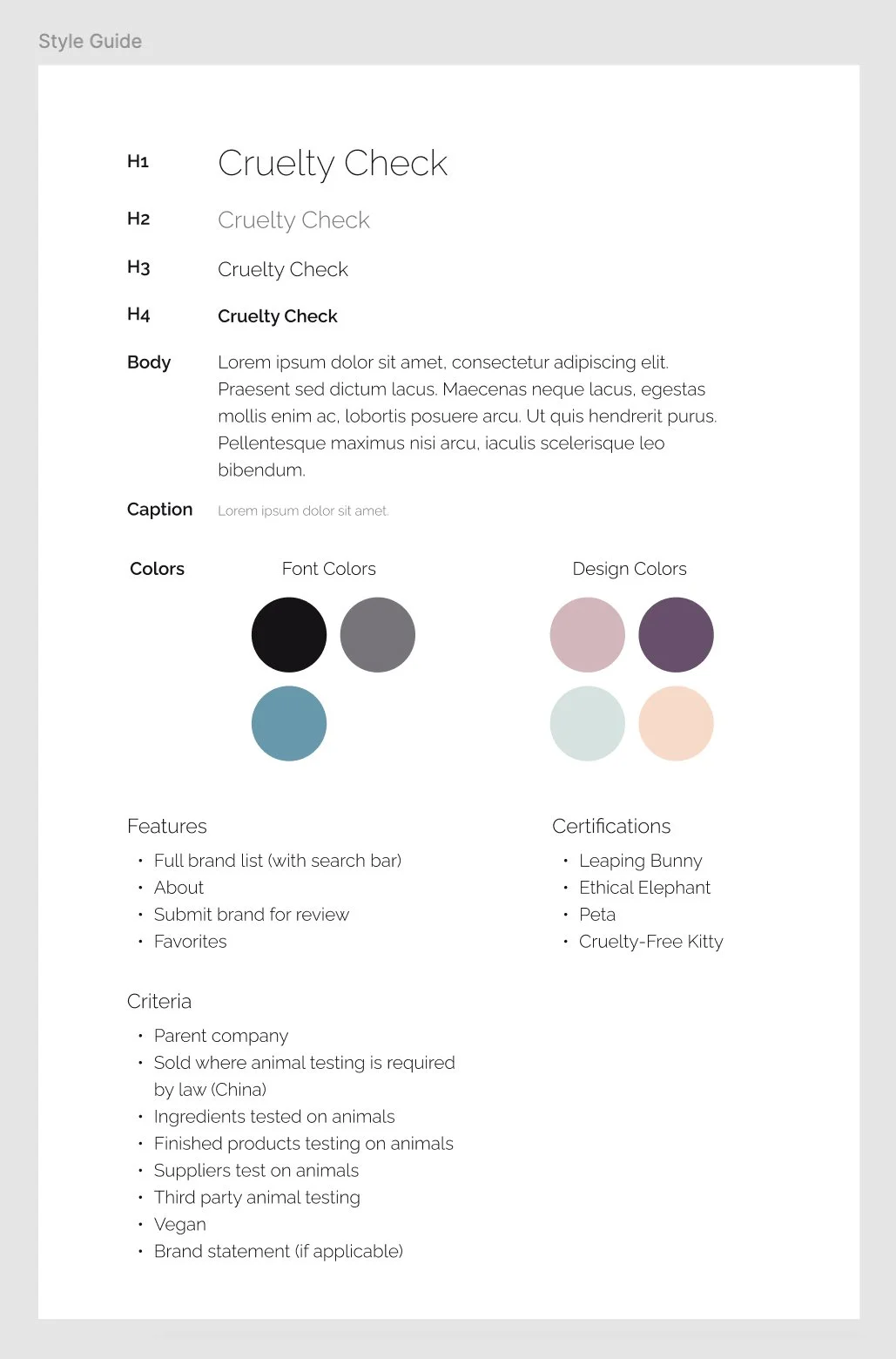 As someone who loves animals and always has, I try to reduce harm as much as possible by living my life in ways that don't contribute to their suffering. One way I do this is by ensuring the products I'm buying are cruelty-free, as I don't want my money supporting companies that test on animals. However, verifying a brand’s cruelty-free status can be challenging, as different sources may provide conflicting or outdated information. So I often found myself cross-referencing different websites to get the full picture. This gave me the idea to design an app that would consolidate all of that information in one place. I was also looking to expand my Figma knowledge, so I thought this would be a great opportunity to dive into the program, up my skill level, and build a prototype.