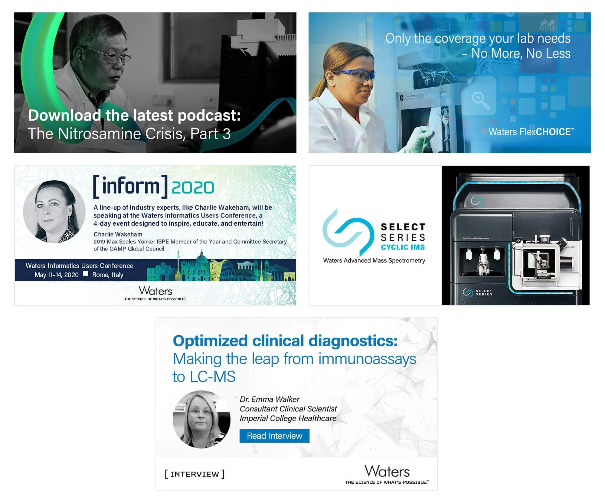 During my time at Waters, I designed a wide range of social media graphics to support various campaigns and initiatives. These included promotional content for events, instruments, software, podcasts, and more—each formatted for platforms like LinkedIn, Facebook, and Twitter. The goal was always to create engaging visuals that aligned with brand standards and captured attention in fast-moving feeds.